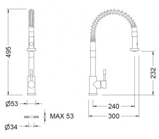 Merkmale: 1) Körper, Griff, Dusche und Feder aus Edelstahl AISI 304. 2) Keramikkartusche Ø35. 3) Ausgestattet mit Stahlbefestigungssatz. 4) Ausgestattet mit 10x1 - F 3/8" 55 cm Anschlusssatz. 5) Höchsttemperatur: 85 °C. 6) Empfohlene Höchsttemperatur: 65°C. 7) Höchstdruck: 10 bar. 8) Mindestdruck: 0,5 bar. 9) Empfohlener Druck: 1 - 3 bar.