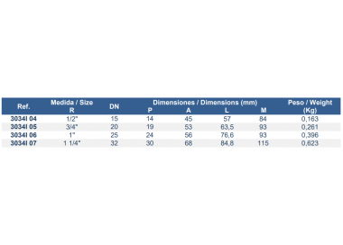 1. Removable and monoblock (only up to 2”) check valve. 2. Hot-forging brass according to UNE-EN 12165. 3. Threaded female ends gas (BSP) acc/ ISO 228/1. 4. Working temperature: Air: -20 ºC to 100º C. Gas: -20 ºC to 60º C. Water: 0 ºC to 100º C. 5. Maximum working pressure 25/18/12 bar (PN-25/ PN-18/ PN-12) 6. Suitable for all kind of industrial, pneumatic and hydraulic installations. 7....