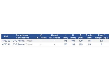 PN 10. Normally closed. Indirect acting. Fluid temperature +5ºC / +50ºC. Body in iron G-25. Hydro-membrane reinforced with nylon. Gas threaded ends. With epoxy paint. Normally opened on request ref. PL4722.