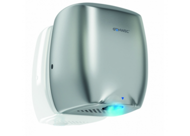 The hot air hand dryer consists of a one-piece casing in 2,5 mm silver aluminium. The base-casing assembly which makes up the hand dryer is fixed to the wall by means of 4 holes with the dimensions for an 8 mm drill bit. The dryer is operated by an electronic infra-red sensor and it automatically stops after the hands have been withdrawn from the sensor field. The universal brushless motor, located in the centre of the volute, produces 23.000 r/min The dryer delivers an airflow of 2.333 l/min (140 m3/h) at a speed of 230 km/h. The air flows as long as the user continues to use it. The dryer has a total power rating of 900W at 230V with a maximum consumption of 3,9A. The noise level at 2 metres is 72 dB. The protection class against splashing is IP22. The total measurements of the hot air hand dryer are 287 x 205 x 180 mm, and its total net weight is 4,5kg.