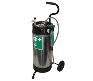 ClassicLine mobilna stanica za ispiranje očiju sa spremnikom od nehrđajućeg čelika - spremnik od nehrđajućeg čelika, kapaciteta 16 litara, na ručnim kolicima s gumama od pune gume - dovod vode preko velikog preklopnog poklopca na spremniku, priključak za komprimirani zrak, ventil za napuhavanje gume - za mobilnu upotrebu ili kada nema priključka za vodu - aktiviranje aktiviranjem ručnog...