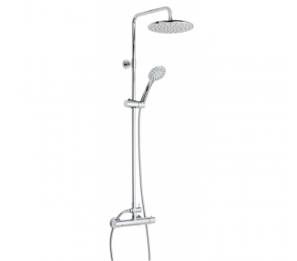 1) Izrađeno od mesinga prema UNE-EN1982. 2) Ručke od ABS-a. 3) Kromirano prema EN 248. 4) Plastični termostatski uložak. 5) ¼ okretaja keramičke glave 6) Keramički diverter. 7) Klizni i podesivi rotirajući držač. 8) Opremljen s 1,5 m. kromirano fleksibilno crijevo od nehrđajućeg čelika, podesivi raspršivač s mlaznicama protiv kamenca i 3 funkcije ručnog tuša protiv kamenca. 9) Maksimalna...