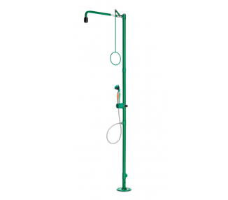 ClassicLine sigurnosni tuš za tijelo s ručnim tušem za oči s jednom glavom za prskanje 45°, montiran na pod - uključujući gornji i donji ulaz vode 1 ¼” ženski za ugradnju u cirkulacijske vodove, čep 1 ¼” od nehrđajućeg čelika - temeljna ploča s 4 montažne rupe od nehrđajućeg čelika, kemijski otpornog zelenog premazanog praha, promjera 200 mm - stalak cijev 1 ¼” od nehrđajućeg čelika,...