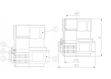 PN 16 puni otvor. Kovani mesing UNE-EN 12165 Ženski završeci ISO 228/1. "RAC-GE" nepropusni sustav za spajanje na cijev. Radna temperatura: -10 ºC do 90 ºC. Primjenjivo za spajanje polietilenskih cijevi male, srednje i visoke gustoće.