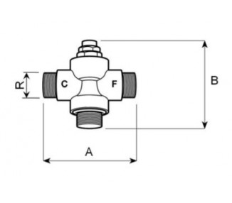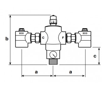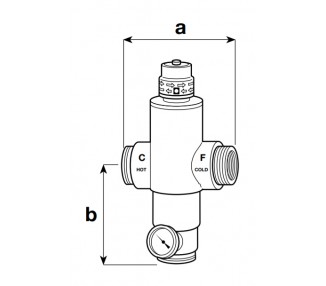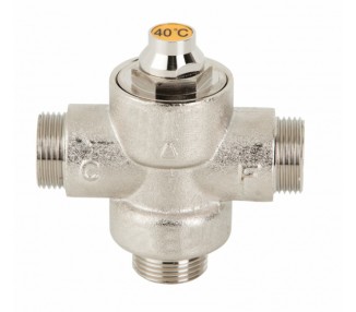 Termostatski mešalni ventil za centralizirane sisteme tovarniško nastavljen na približno 45°C – možnost izbire temperature z vrtenjem ročaja in odčitavanje potopnega termometra, ki je nameščen na ohišju mešalnika – varnostna naprava proti oparinam – ponikljano. Najvišja vroča temperatura: 85°C Območje nadzora: 20-65°C Največji tlak: 10 barov