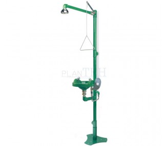Varnostni tuš s tušem za oči in umivalnikom iz polipropilena, z nožnim aktiviranjem. Izdelek je sestavljen iz varnostnega tuša in tuša za oči. Varnostni tuš je sestavljen iz pocinkane jeklene podlage in razpršilne glave iz kromirane medenine. Razpršilna glava ima na vrhu pretočni ventil iz pocinkanega jekla z ročajem za aktivacijo. Samodejni pretok tuša je 120 l/min pri 1 bar. Izpiranje oči v...