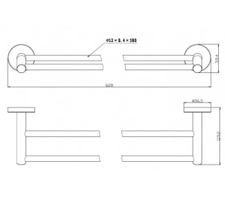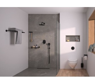 SESTAVNI DELI IN MATERIALI – nerjaveče jeklo AISI 304. Pritrjen na steno z dvema vijakoma. - Glavno telo – nerjaveče jeklo AISI 304, mat črn praškasti premaz (RAL 9004). Pritrjen na stensko ploščo z enim imbus vijakom iz nerjavečega jekla. Izdelek vključuje odprt obroč za brisače in zadnji okrogli sidrni pokrov za namestitev. - Komplet pritrdilnih elementov - dva stenska vložka Ø 6 mm, dva...