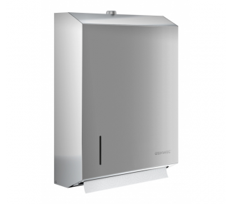 DELOVANJE - Enota izda papirnate brisače, prepognjene v obliki črke C ali Z, z največjo merami papirja 260 x 98 mm. Vrata se odklenejo z enim od dveh ključev, ki sta priložena enoti, in se obrnejo navpično za polnjenje razpršilnika. Vodoravna reža razkrije raven papirja za lažji nadzor. Enota lahko razdeli 600 enot C-zloženih ali 450 enot Z-zloženih papirnatih brisač