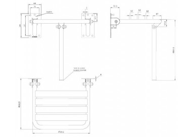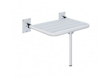 Zložljivi tuš sedež z nogo je izdelan iz karbonsko jeklene konstrukcije, privite na sedežno površino iz lamel iz karbonskega jekla. Njegova struktura je izdelana iz karbonskega jekla, premera 32 mm, debeline 1,5 mm, in je pritrjena na dva stenska nosilca iz karbonskega jekla, debeline 3 mm. Konstrukcija se obrne za kot 90 ° na stenskih nosilcih, da lahko sedež zapustite v pokončnem položaju. Sestavljena enota ima bel epoksi lakiran zaključek in njegovi materiali zagotavljajo pravilno vzdrževanje in čiščenje. Tuš sedež je pritrjen na steno z 8 vijaki 8 x70 mm in 8 najlonskimi stenskimi čepi 10x50 mm, ki podpirajo statične obremenitve do 227 kg. Skupne mere izdelka so 820 x 520 x 450 mm.