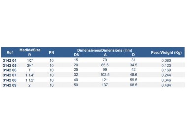 1. Kontrolni ventil. 2. Medeninasta konstrukcija v skladu z UNE-EN 12165. 3. Konci navojev plin (BSP) ženski v skladu z ISO 228/1. 4. Delovna temperatura od -20ºC do 100ºC. 5. Primerno za sanitarno vodo, ogrevanje vklopljeno klimatske naprave in sistemi stisnjenega zraka. 6. Lahko se namesti v vodoravnem, navpičnem ali poševnem položaju. 7. Z vstopnim sitom. 8. NBR tesnilo (guma) 65 shore. 9....